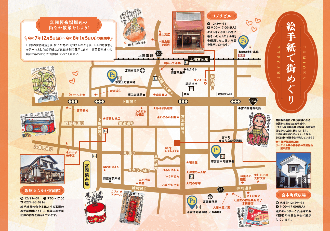 「日本の世界遺産」や、描いた方の「守りたいもの」や、「レトロな世界」をテーマとした絵手紙などを28店舗で展示します。富岡製糸場の展示とあわせてぜひ散策してみてください。