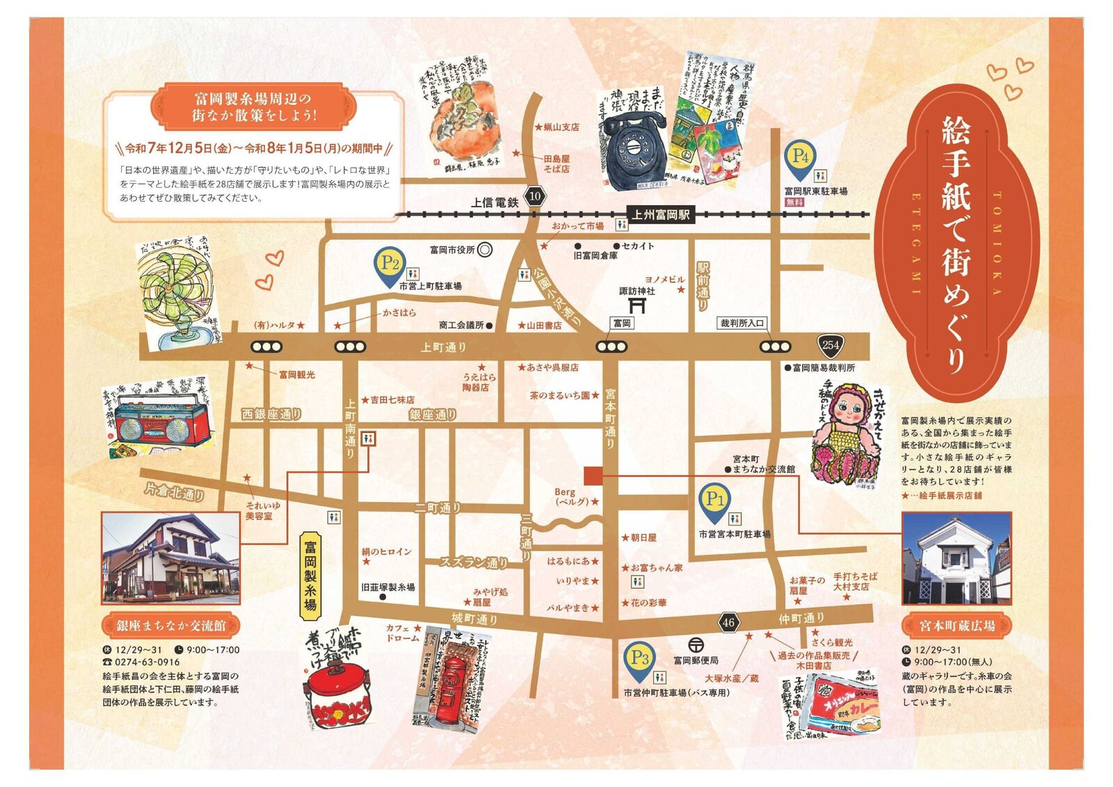 「日本の世界遺産」や、描いた方の「守りたいもの」や、「レトロな世界」をテーマとした絵手紙などを28店舗で展示します。富岡製糸場の展示とあわせてぜひ散策してみてください。