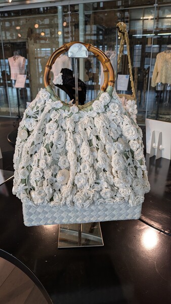 上部は、レース針を用い、ビーズやスパンコールを用いた花々と、富岡シルクのみで編んだ花や紅葉のモチーフで構成。500枚を超えるレース編みのモチーフを細絹糸でかがりつなぎ、両サイドにはモチーフとお揃いのビーズ編みのボタンを添え、花籠からあふれ出す物語を立体的に描きました。