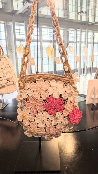 桜の花のモチーフを使ってジュリアードレースの技法でバッグに仕上げてみました。富岡シルクの純白で光沢ある糸で編む桜の花はとても美しいと思わせていただきました。1本の糸で編んだり、2本を引き揃えて編んだり、富岡シルクとGENシルクと合わせて仕上げてみたりしました。穏やかな色彩の中に華やかさを求め、気品あるシルクの光沢をより一層輝く様にパールやビーズなど施してみました。春に咲く桜が待ちどうしい、そんな想いで桜のバックを仕上げました。