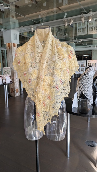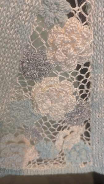 富岡シルクのコーンシルクとアルフィーネ(水色)でバラ模様のワンピースを作成しました。スカート6枚はぎの間のメッシュワークのモチーフがポイントです。見えにくいですが是非観てください。シルクとミラモアのバラ模様のストールもセットで編みました。シルクの光沢が美しいです。作成には大変時間がかかりましたがこれからも富岡シルクで作品を作り続けたいです。