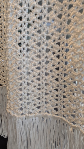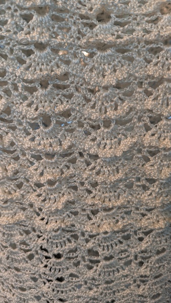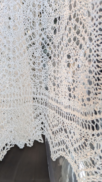 細い糸で透け感を出したくて棒針2号でコツコツと編みました。編んだ期間は連日湿度が低く静電気で糸が指にまとわりつき苦労しました。シルク混の糸は時々使用していましたがシルク100%の糸は初めてで特性がわからず糸の質感を生かしきれなかったのが残念でした。もう少し光沢感が感じられる模様を探し出したいです。