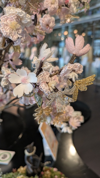 日本を代表する花木、”桜”を絹糸で表現しました。柔らかで暖かみのある色のトーンで濃淡をつけ、シルクの良さを引き出しています。春の陽射しを浴びながら桜の木の下でのんびりと読書を楽しんでいる親子を遊び心で表現。緑の草原は麻ひも、その他はブリオンと繭玉で桜の花びらを表現。この技法は18世紀中頃ヨーロッパで発祥したといわれている伝統ある技法を現代風にアレンジした室内装飾品です。ハーブのクローブ、シナモン、スターアニスやコーヒー豆なども使用し、香りも楽しめる作品です。