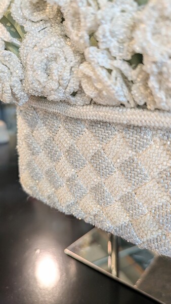 下部の格子には、富岡シルクにガラスビーズを通し、1.2mmの棒針でバスケット編みに仕立てました。一目ごとに一粒ずつビーズを送り、きらめく花籠の姿を表しています。