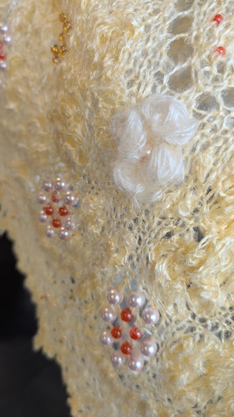 ぐんま黄金を見たときに、この糸の持つ気品と、パターンの美しさを合わせたいなと思いました。ご覧下さる方々に、優しい思い出の微笑みがふとこぼれるような、そんなショールにしたいと、ビーズやモヘアを選びました。棒針レースやナップ、ビーズ等初めての技法ばかりでしたが、楽しく編めました。