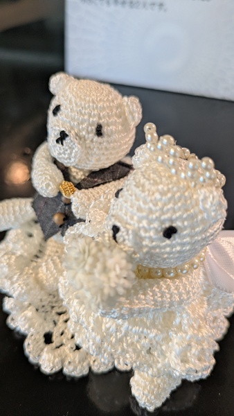 かわいいくまさん達の結婚式。新郎くまさんは、本物のスーツの生地のベストと金の指輪を持って花嫁くまさんはブーケとティアラでおめかしです。フリルドレスもシルクで編んでます。いつまでも元気に仲良く幸せにと言う願いを込めて花の上に座らせました。小さくても幸せな2人です。